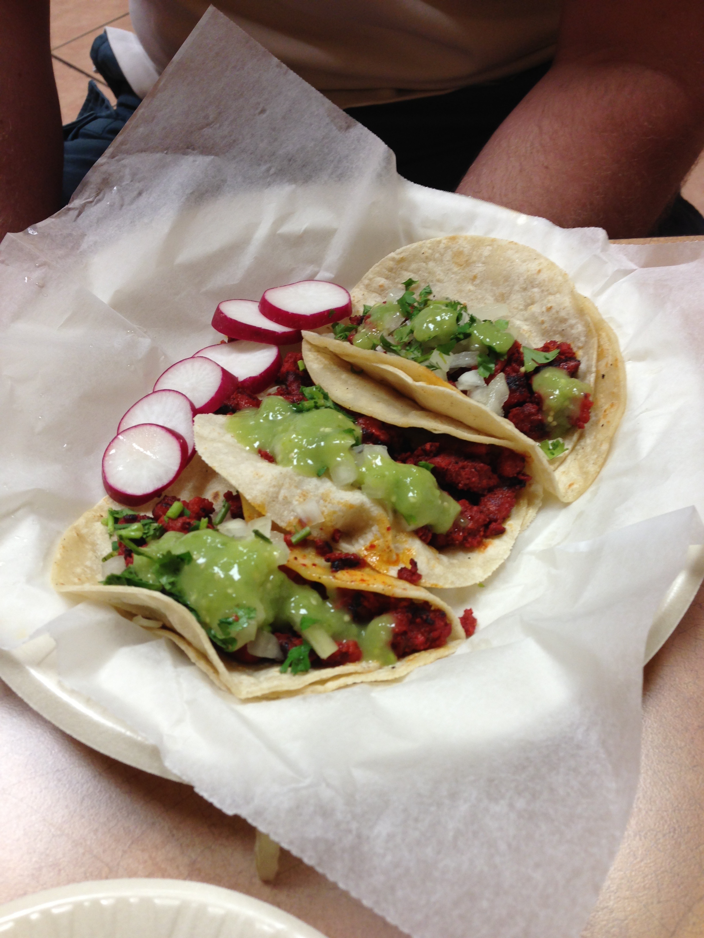 The food arrived and we were both delighted with what we got–especially for a grand total of about thirteen bucks! The corn tamale was deliciously sweet and buttery (don’t tell me if it was lard). The tostadas and tacos were served with a side of salsa, onions, limes and cilantro. The flavors were fresh and bright.