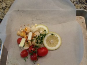 Basically, this is how it goes: in a parchment packet, steam-roast a few cherry tomatoes with some hearts of palm, a bit of garlic, some thyme, a couple slices of lemon, some olive oil and a pat of butter. If you are lucky enough to live down the street from Penseys Spices, (like me) or can plan enough ahead to order online, get ye some of their berbere spice blend and throw in a dash or two of that too. “What is berbere,” you ask? Good question. Here’s what Penseys says: