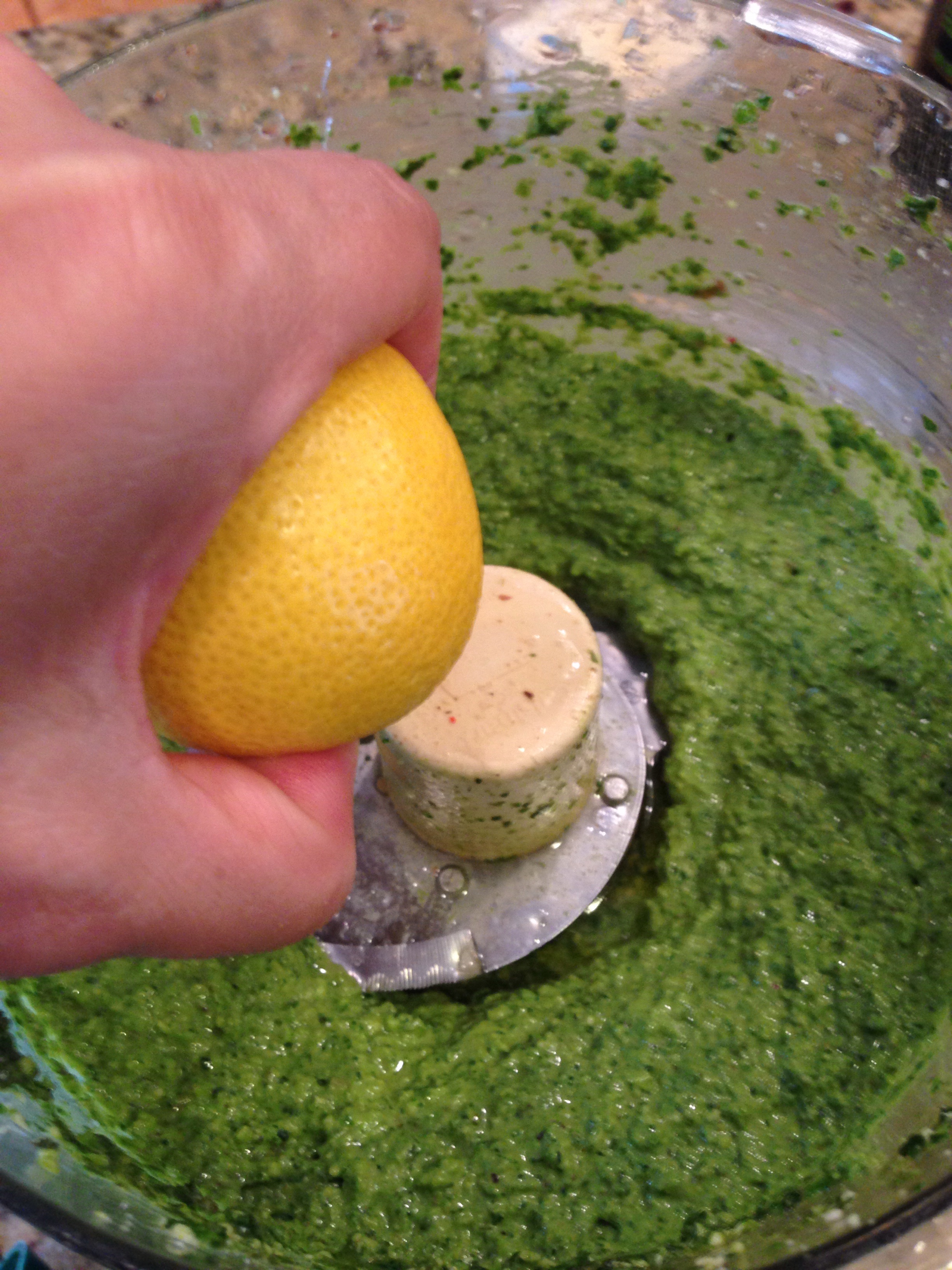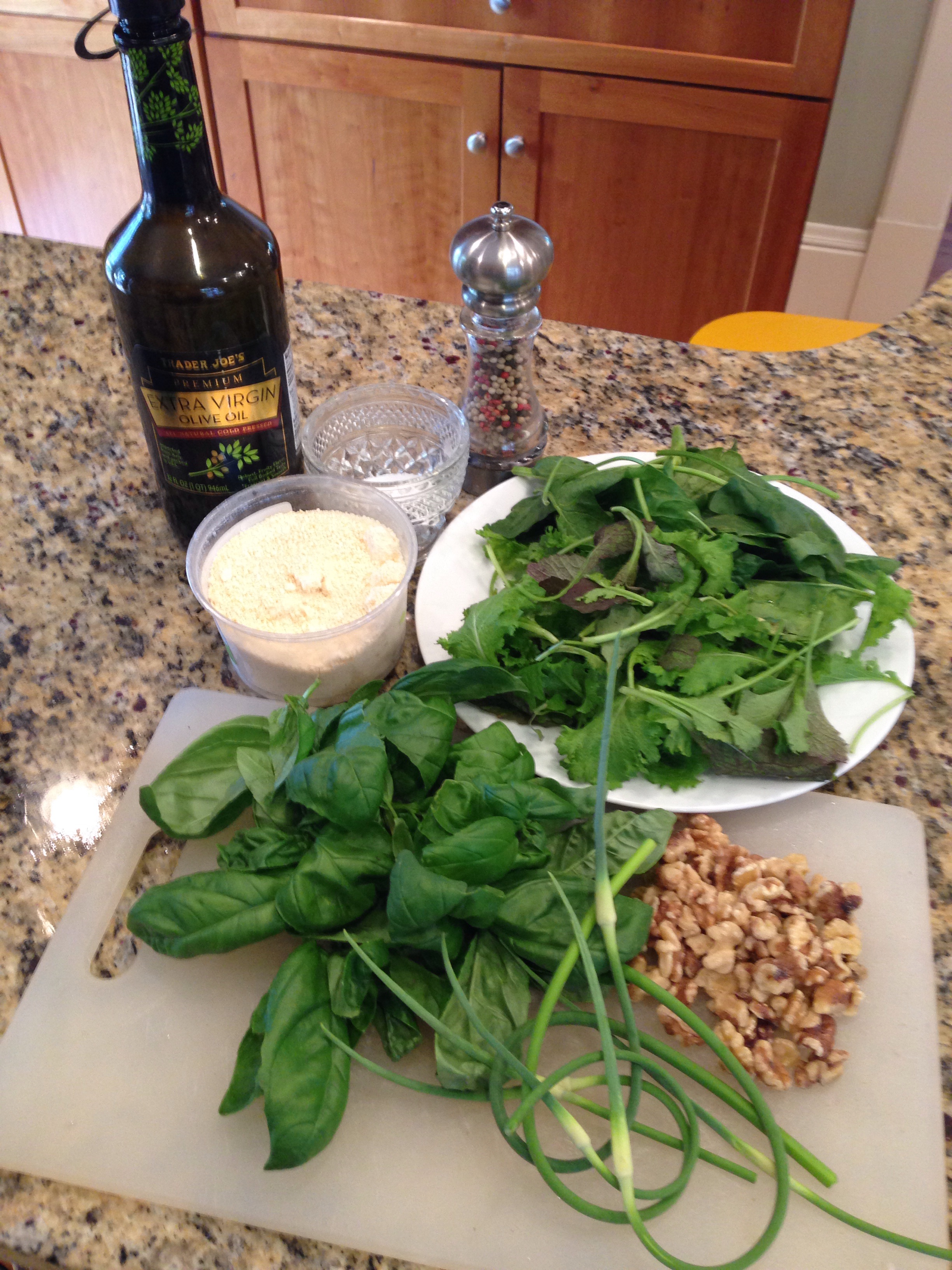 Then I got to making the pesto for the pasta I made later in the week. I started with mustard greens, spinach, and garlic scapes from the CSA box, plus parmesan, salt, pepper, olive oil and basil from our garden pots. I pureed the lot in the food processer.