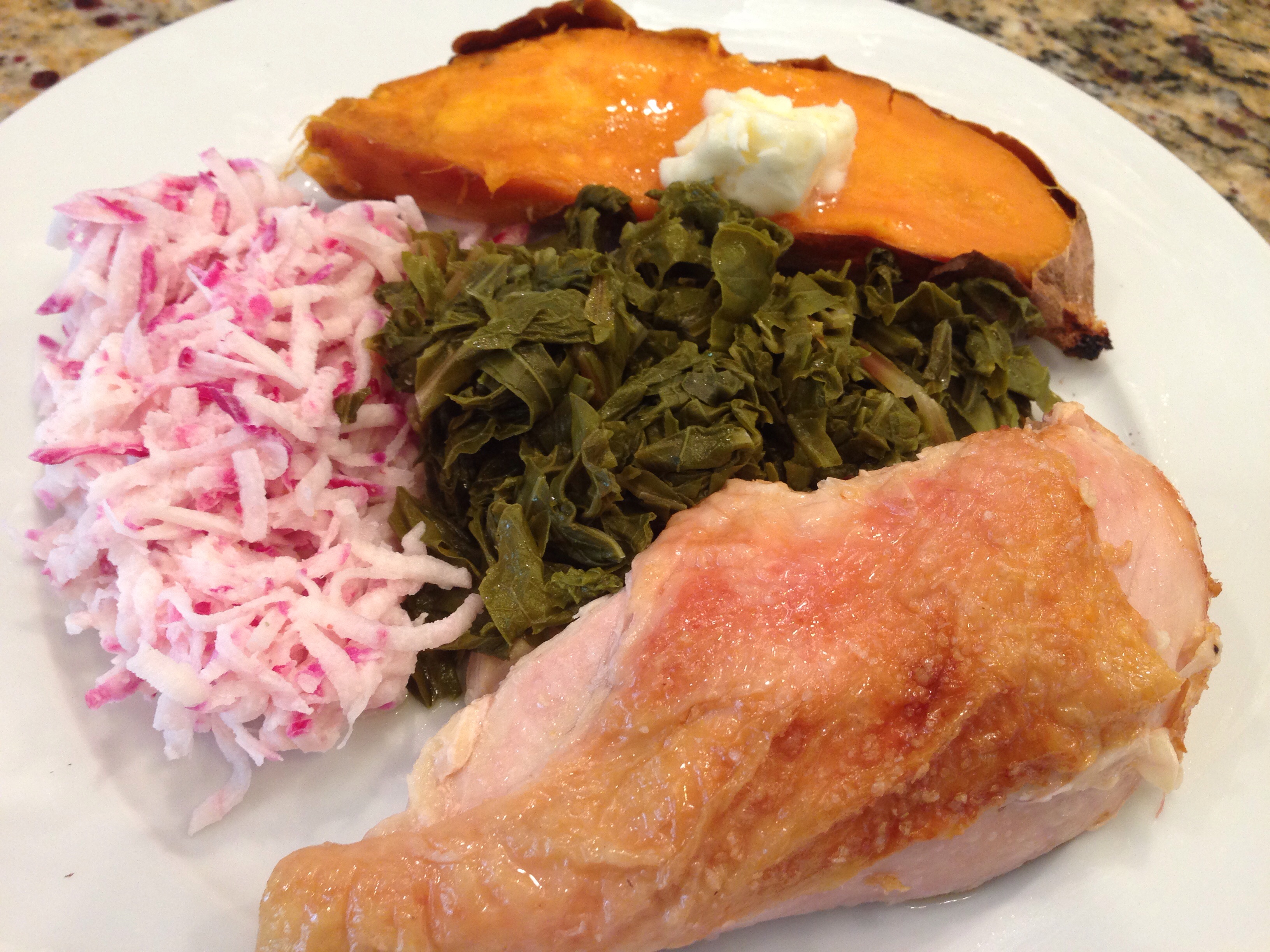 • Chicken with turnip greens*, turnip slaw*, and sweet potatoes