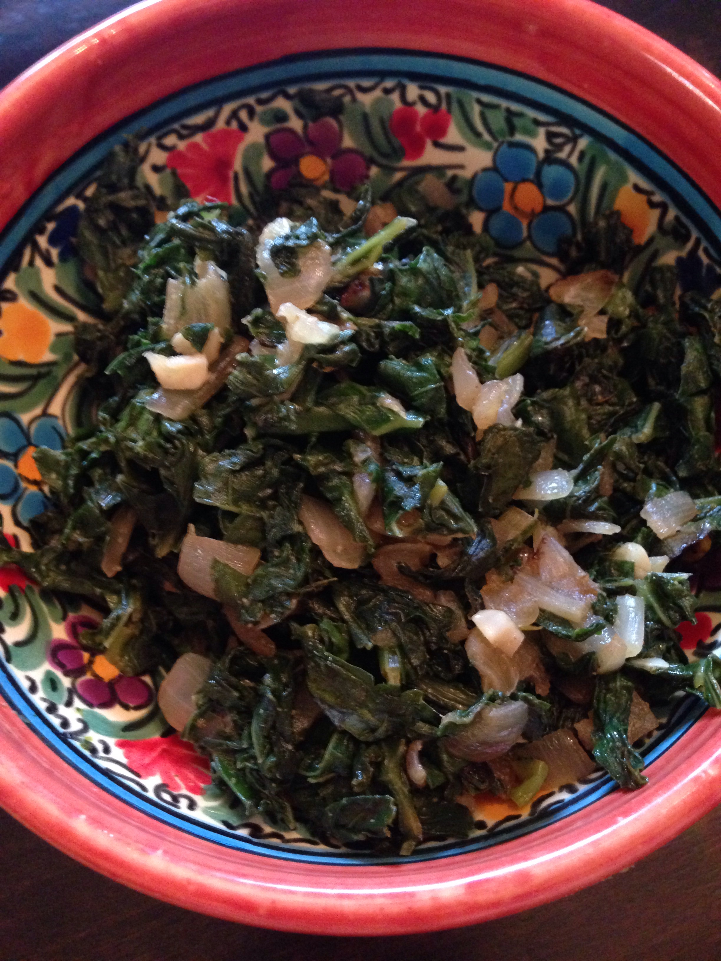 The kale was just a simple sautee of onions, garlic, cumin and kale greens from the CSA. I saved the kale stems to cook up with the mustard green stems for my second soup recipe (below).