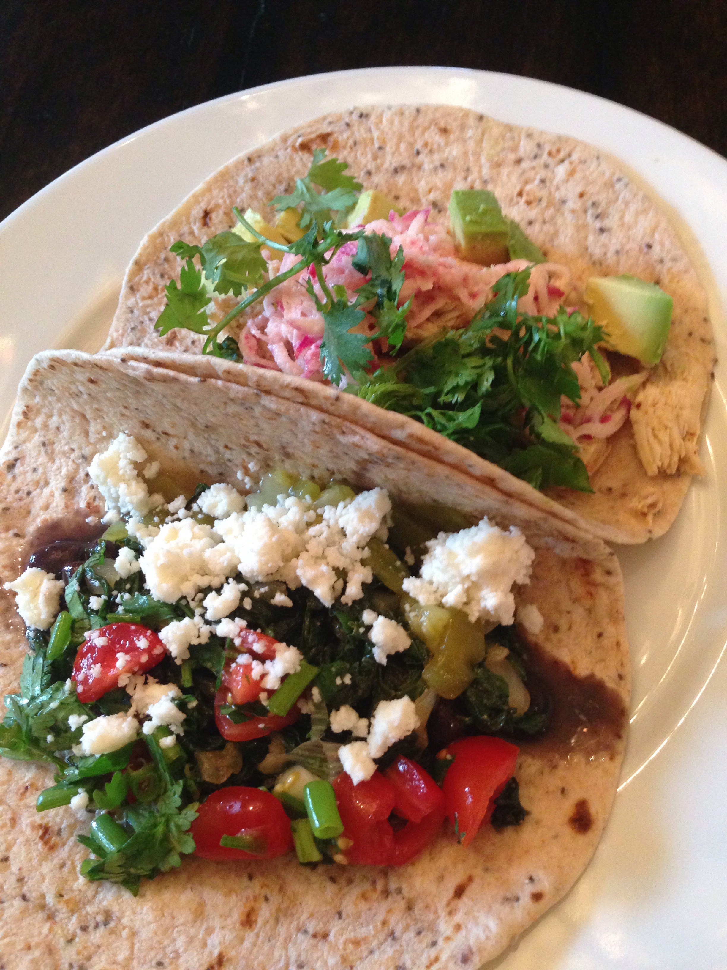 • Tacos with 1) sautéed kale, black beans, pico de gallo and queso fresco; and 2)shredded chicken, citrus turnip slaw, avocado, lime and cilantro