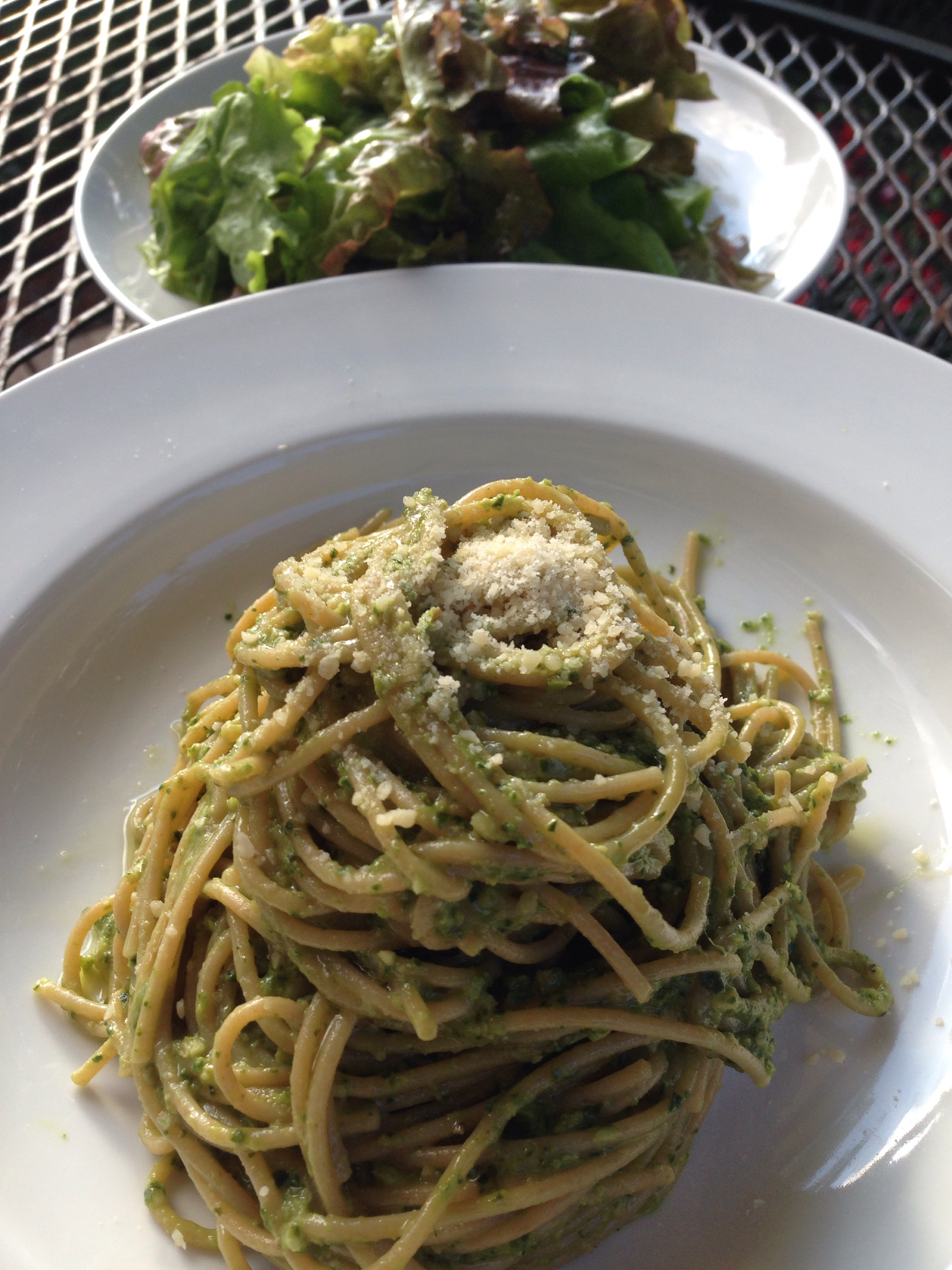 That night we had another salad, plus whole grain pasta tossed with the pesto I made on Tuesday: