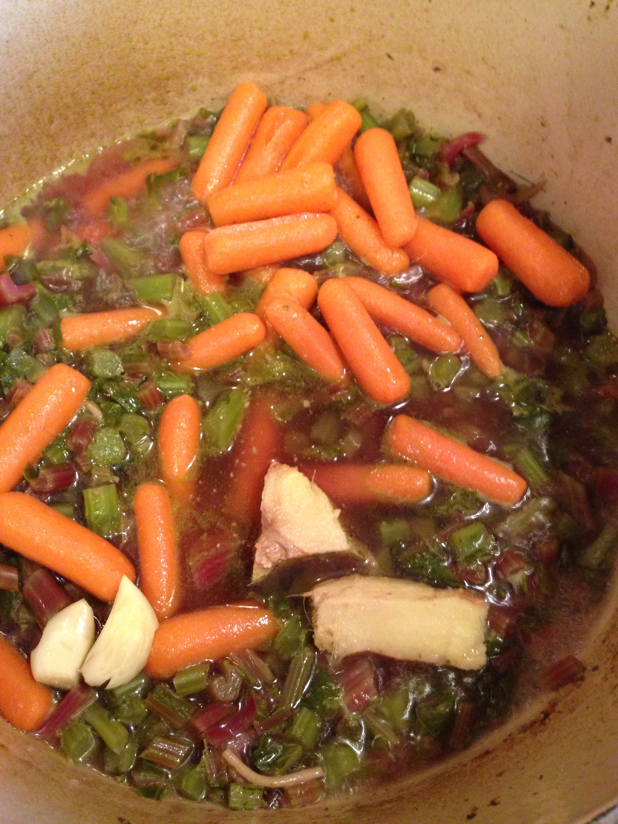 With only a bit of lettuce, some mustard and kale stems and cilantro left, Friday’s lunch had to be fairly creative. I decided to go with a slightly more eastern twist and cooked up some awesome soup. I started by cooking the stems and some carrots in vegetable broth with ginger and garlic.
